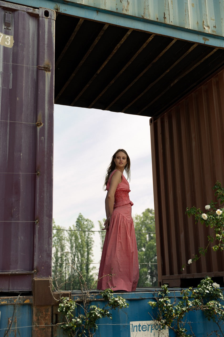 Máxi falda recogida con Rebeca en forma curva alargada hacia los costados. cierre trasero con detalle de botón forrado en la misma tela